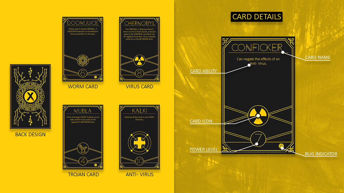 I set the main gameplay objectives and researched and compiled various viruses, worms and trojans that we had through out history to create agents (cards) for the gameplay and derive their unique abilities, and scale their power levels around a narrative.